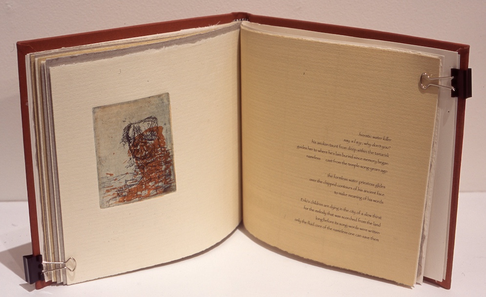 Artist book of etchings and poetry 19.5×17.5×1.5cm. Line etch, sugarlift and aquatint on copper, printed on Fabriano Roma paper. Hand sewn and bound, cloth on card.
