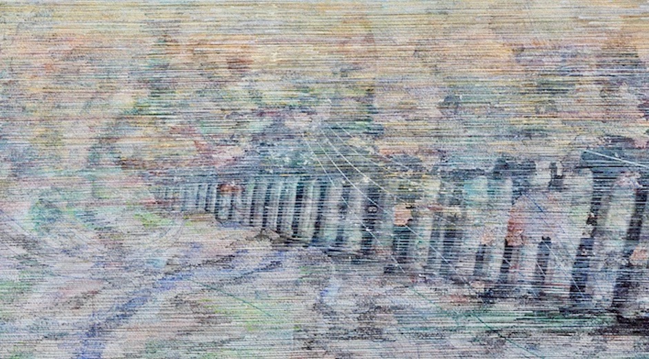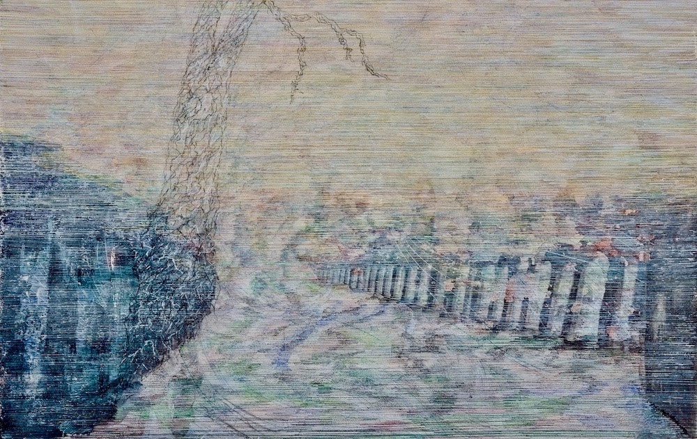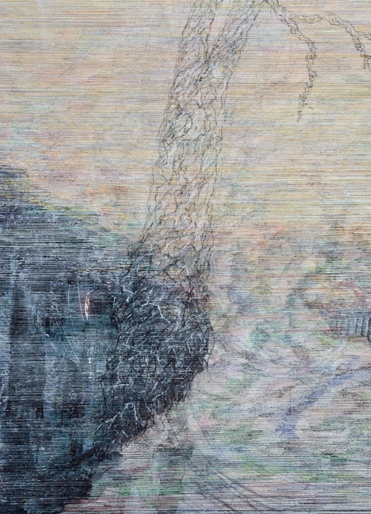 Godot’s Window is a meditation on polarities. Within its multitudinous mostly horizontal ink lines are an engagement with the innate coherence of each set ‑- patent and obscure; permanent and ephemeral; profound and absurd; the muddy waters of Melbourne’s River Yarra and the ethereal mists of Scotland’s Iona. For one to exist so must the other. The third dimension that emerged in the making of this two-dimensional work was that of time. The title draws on the absent pivot of Samuel Beckett’s mid- 20 Century play